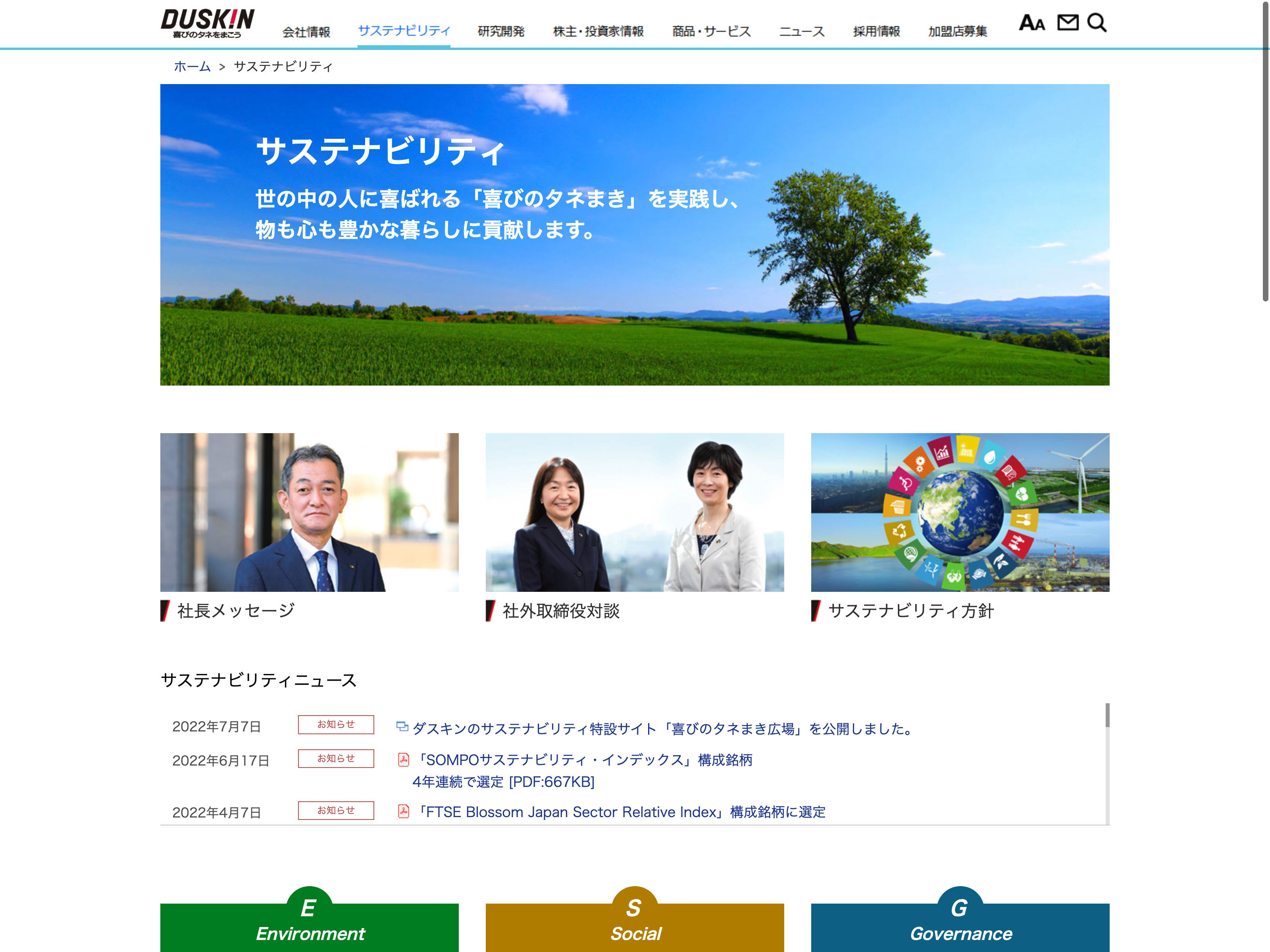 ダスキン Update:2022.10.31 カテゴリー:プライム サービス業 サステナビリティ ビジョン プライバシーポリシー 事業内容 沿革 社長メッセージ 経営理念 詳細 Visit 詳細 Visit