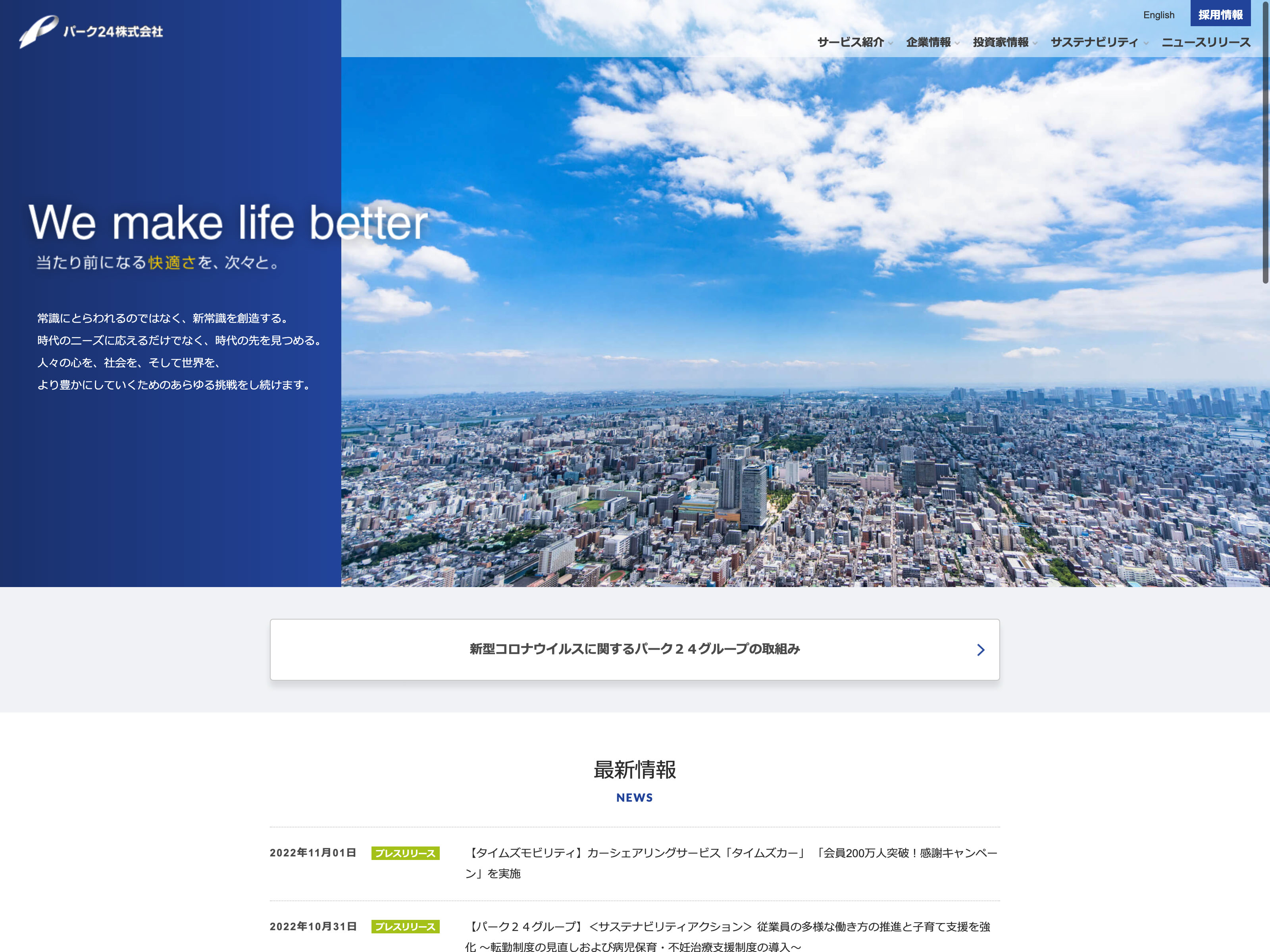 パーク24 Update:2022.10.31 カテゴリー:プライム 不動産業 コンプライアンス サステナビリティ プライバシーポリシー 有価証券報告書 沿革 社長メッセージ 詳細 Visit 詳細 Visit